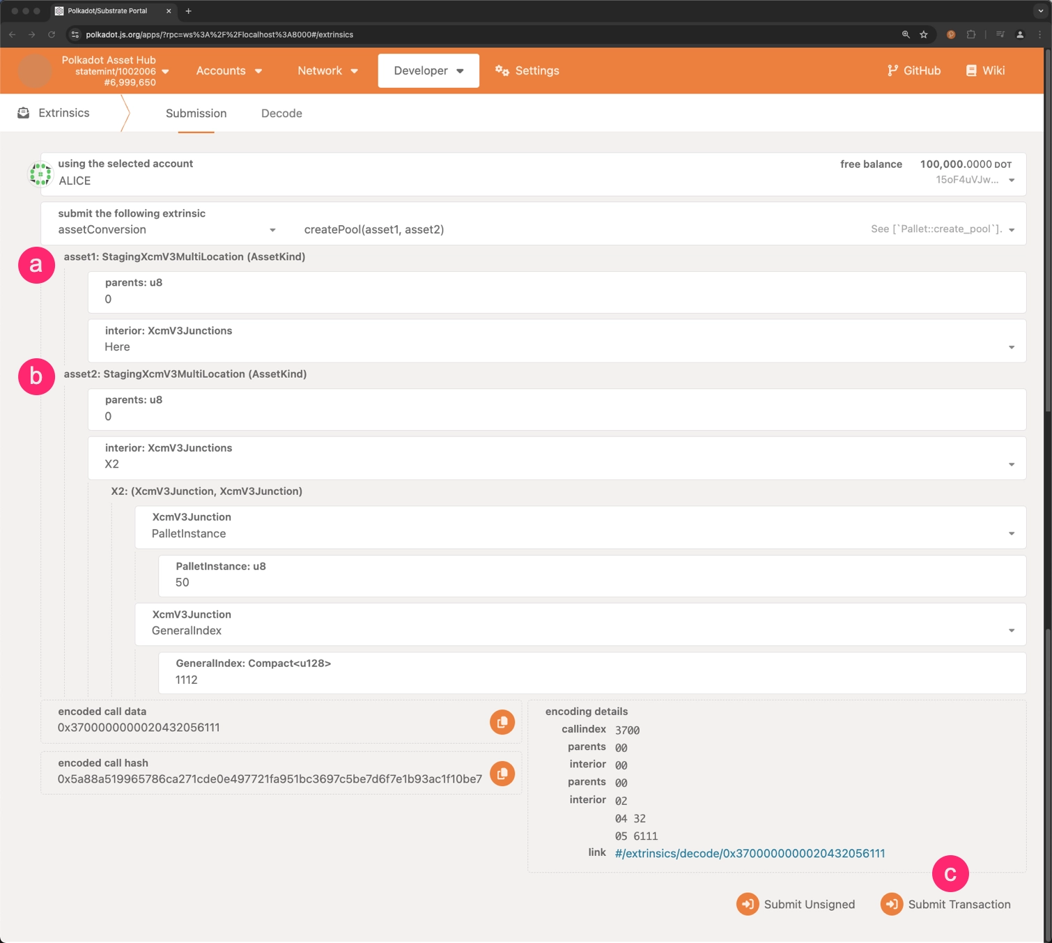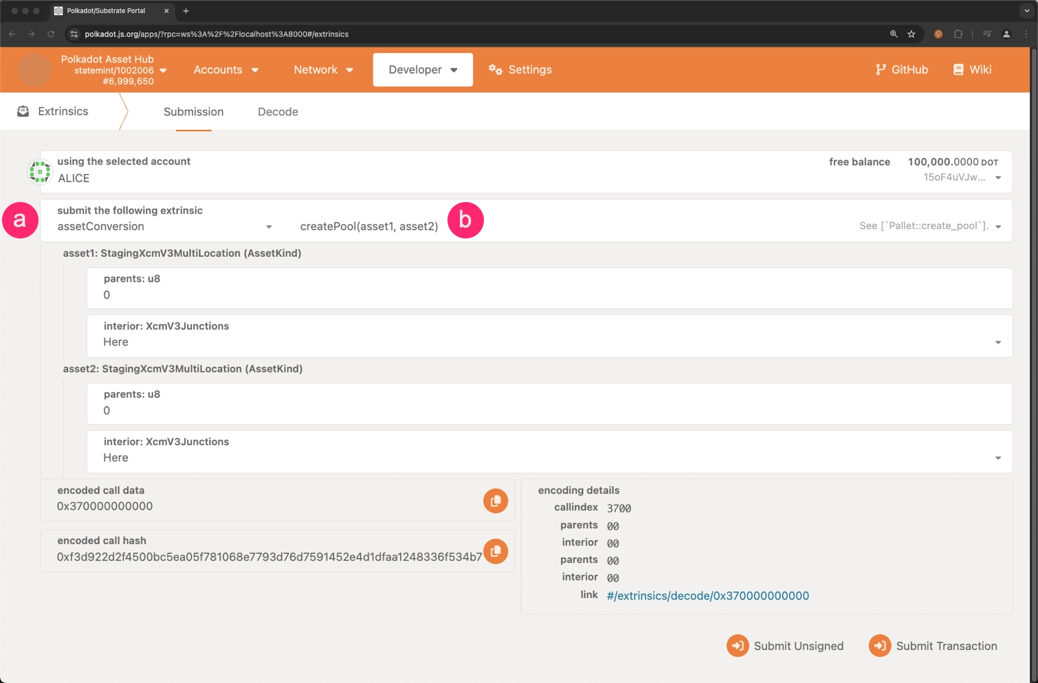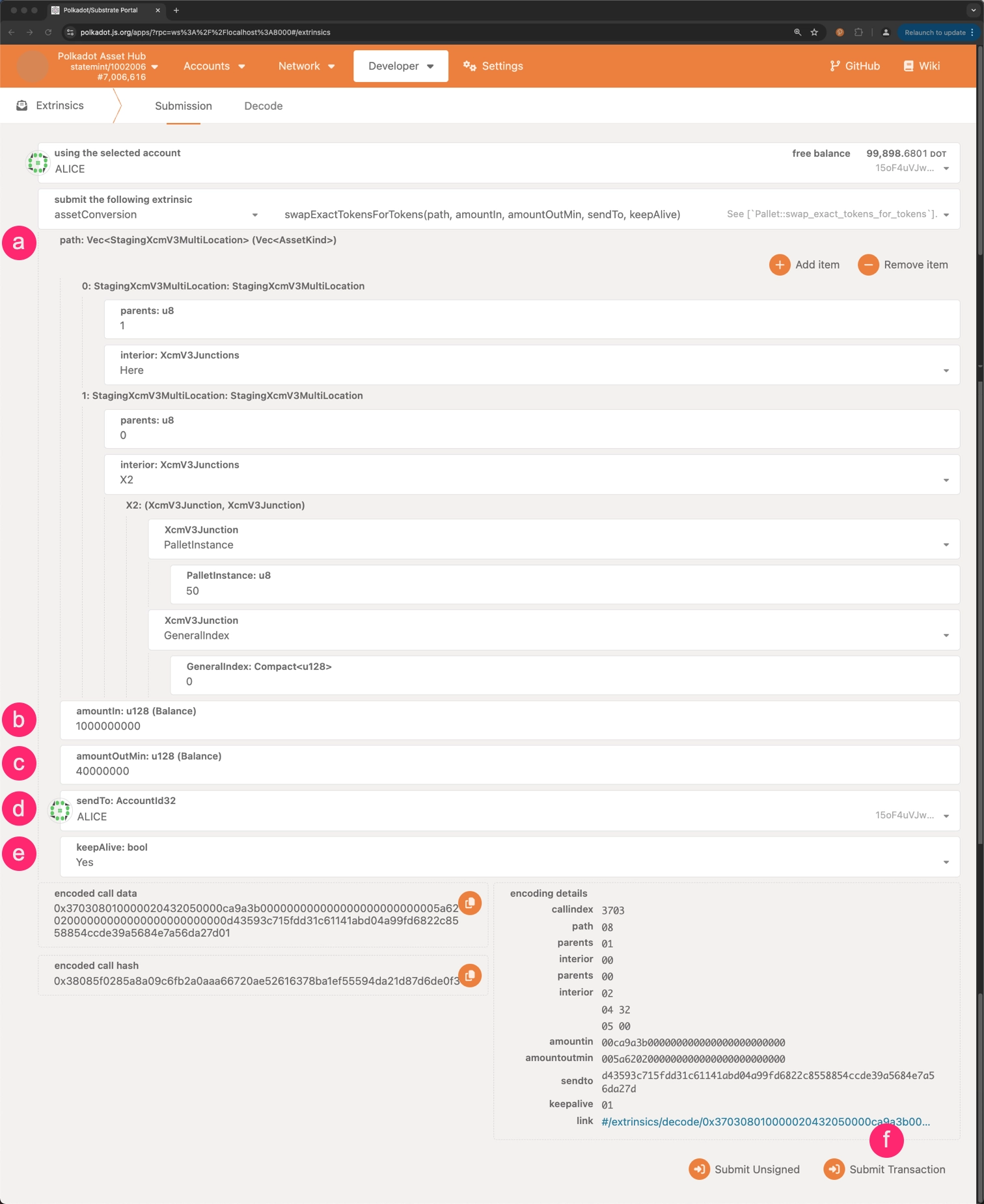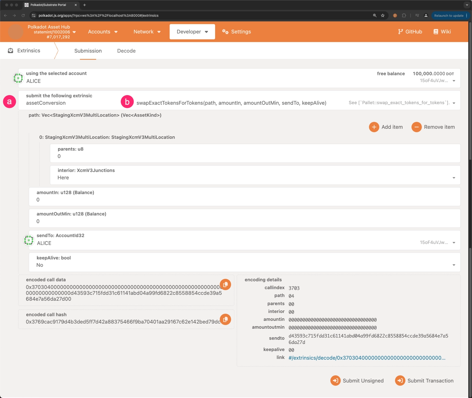 amountOut: The exact amount of the second asset that the user wants to receive. amountInMax: The maximum amount of the first asset that the user is willing to swap.sendTo: The account to which the swapped assets will be sent.keepAlive: A boolean value that determines whether the pool should be kept alive after the swap.- Click on Submit Transaction to swap assets for an exact amount of tokens.