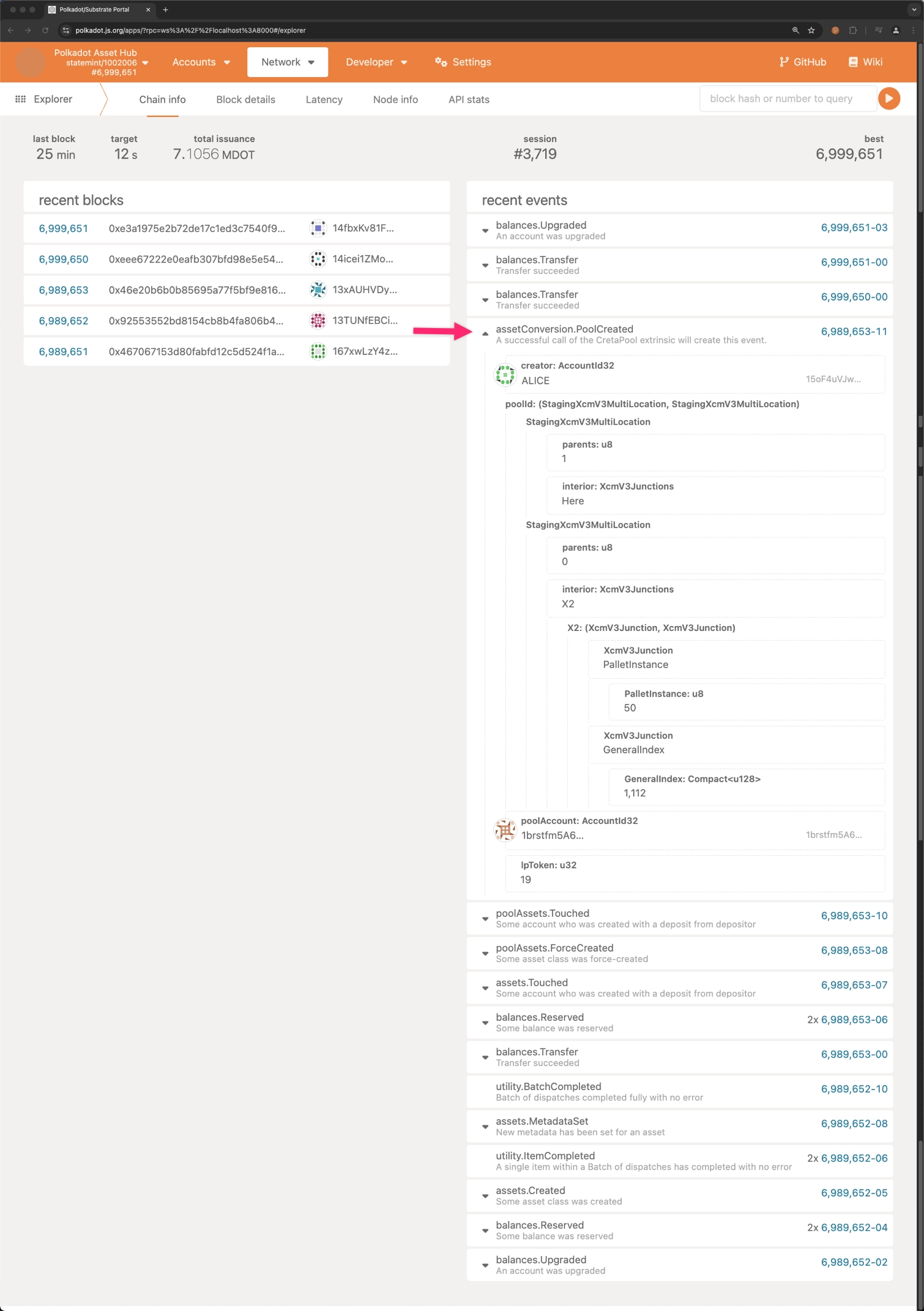 Signing and submitting the transaction triggers the creation of the liquidity pool. To verify the new pool's creation, check the Explorer section on the Polkadot.js Apps interface and ensure that the PoolCreated event was emitted.