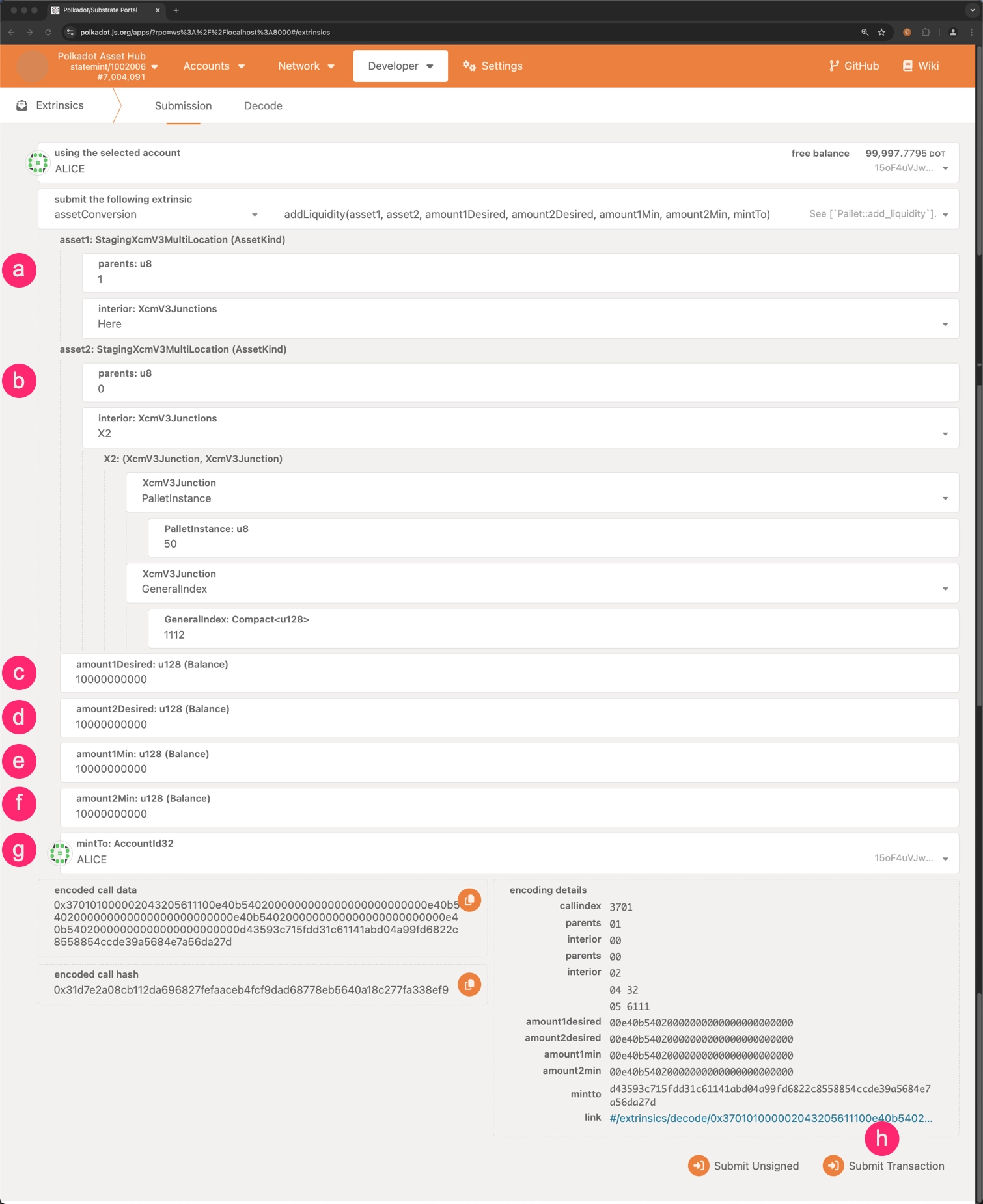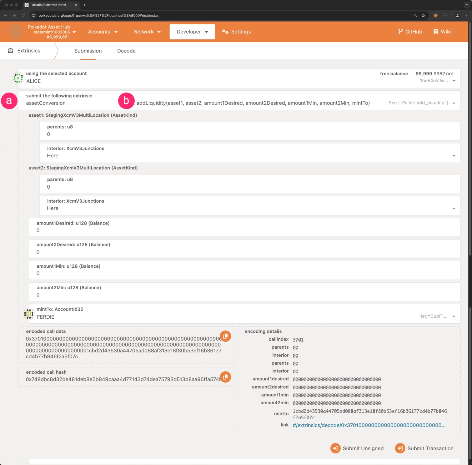 amount1Desired: The amount of the first asset that will be contributed to the pool. amount2Desired: The quantity of the second asset intended for pool contribution.amount1Min: The minimum amount of the first asset that will be contributed.amount2Min: The lowest acceptable quantity of the second asset for contribution.mintTo: The account to which the liquidity tokens will be minted.- Click on Submit Transaction to add liquidity to the pool.