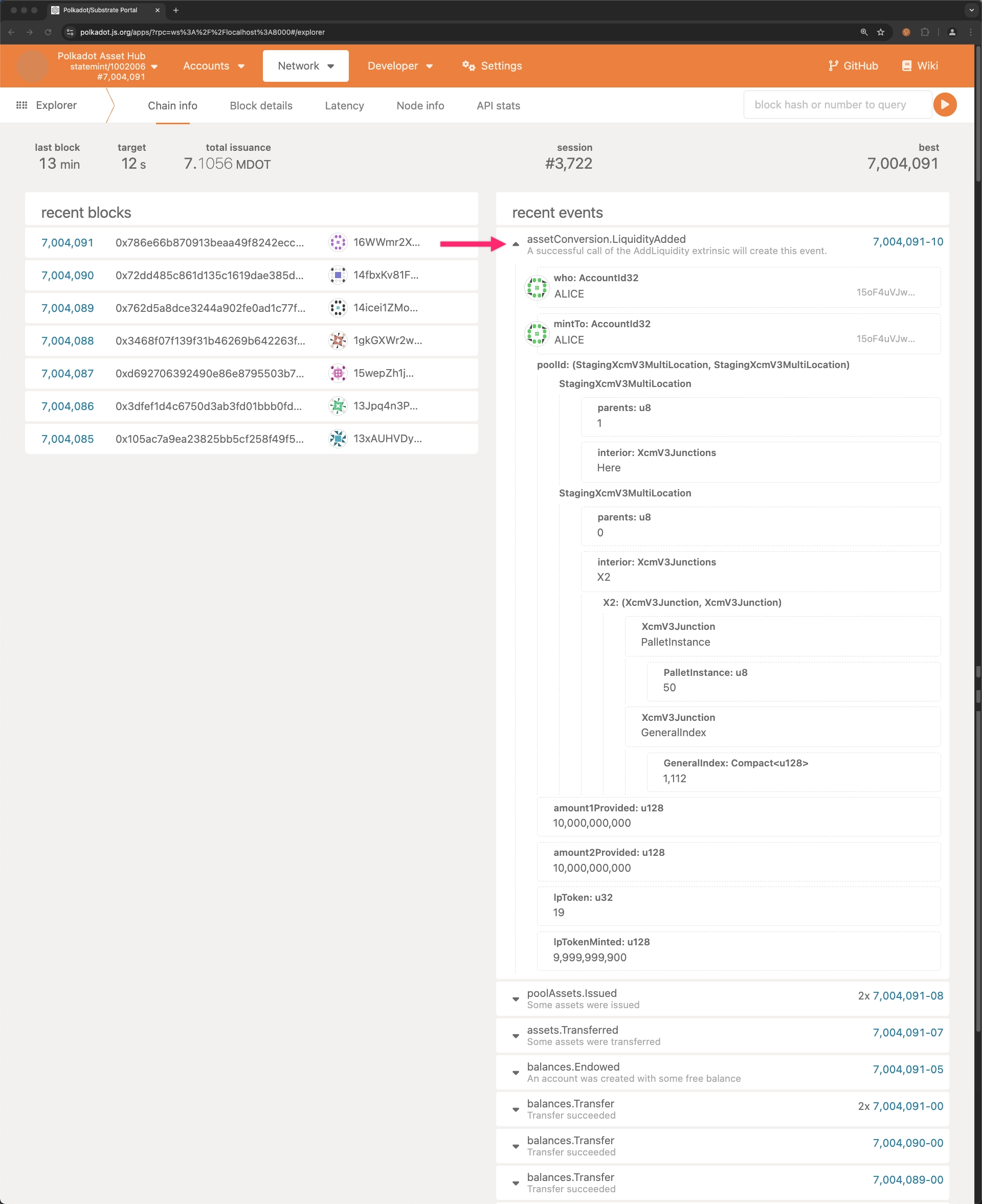 Signing and submitting the transaction adds liquidity to the pool. To verify the liquidity addition, check the Explorer section on the Polkadot.js Apps interface and ensure that the LiquidityAdded event was emitted.