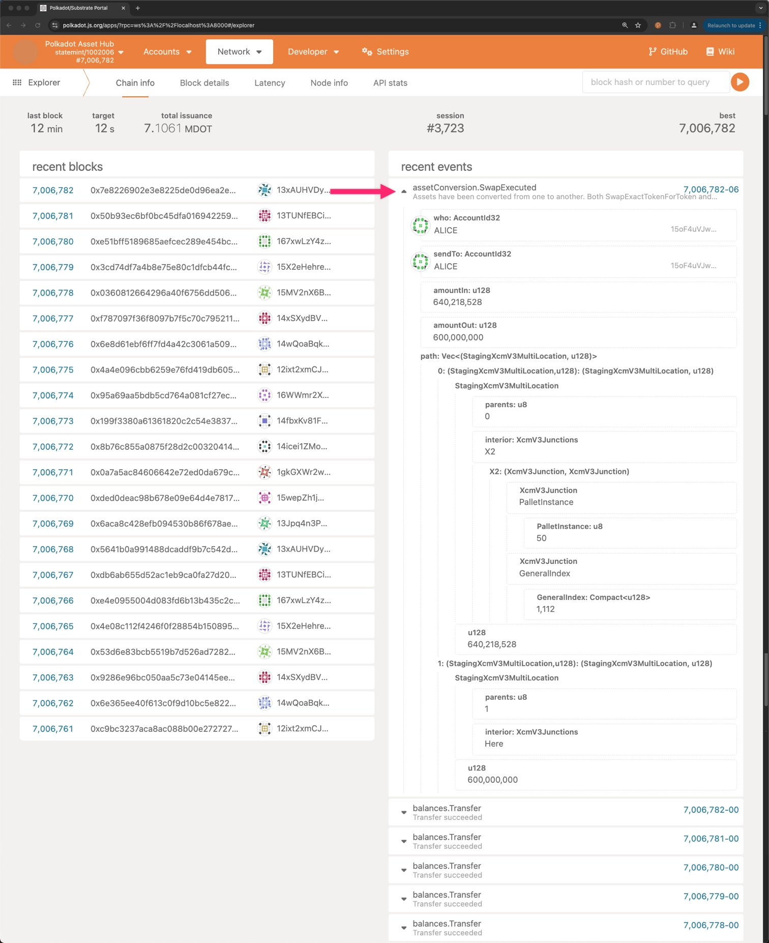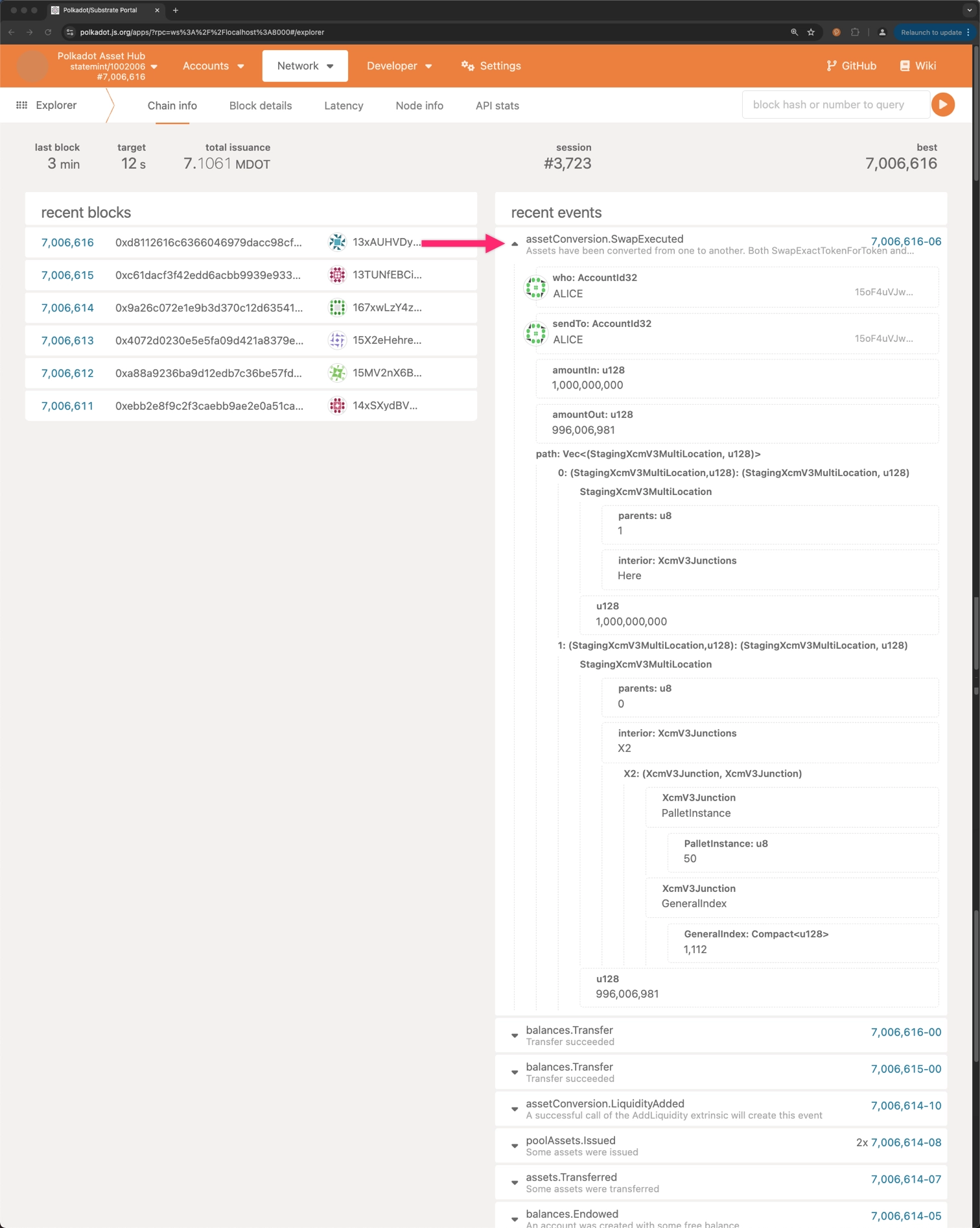 Signing and submitting the transaction will execute the swap. To verify execution, check the Explorer section on the Polkadot.js Apps interface and make sure that the SwapExecuted event was emitted.