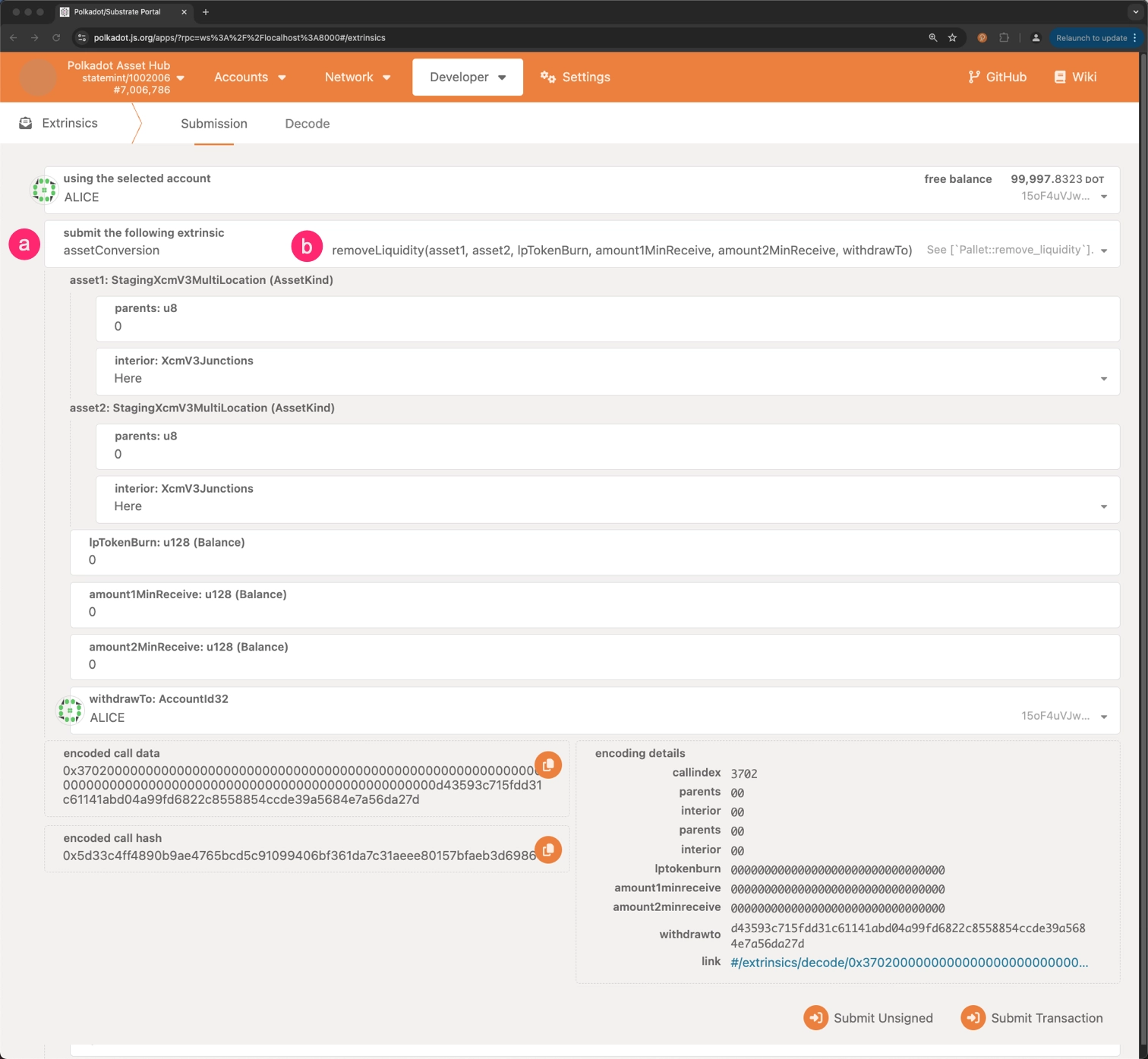 lpTokenBurn: The number of liquidity tokens to burn. amount1MinReceived: The minimum amount of the first asset that the user expects to receive.amount2MinReceived: The minimum quantity of the second asset the user expects to receive.withdrawTo: The account to which the withdrawn assets will be sent.- Click on Submit Transaction to withdraw liquidity from the pool.