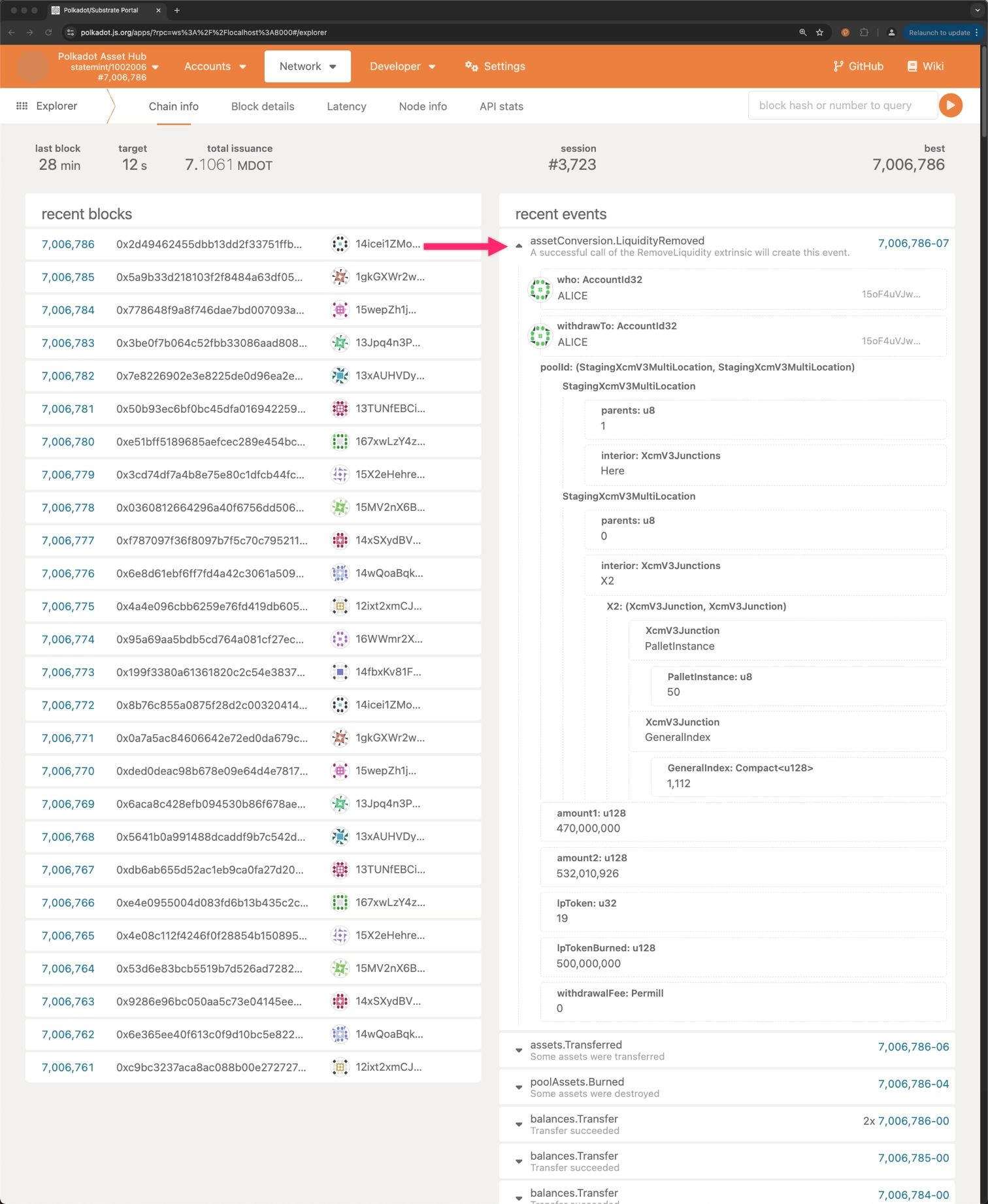 Signing and submitting the transaction will initiate the withdrawal of liquidity from the pool. To verify the withdrawal, check the Explorer section on the Polkadot.js Apps interface and ensure that the LiquidityRemoved event was emitted.