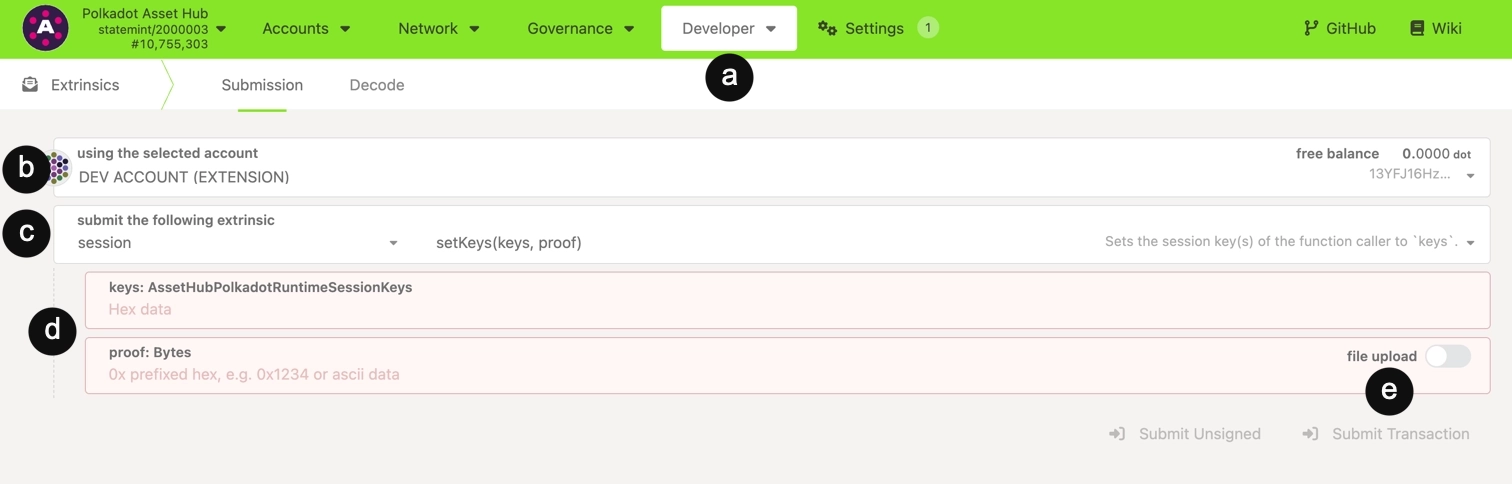 Once approved (or if using on-chain selection), follow these steps to register session keys using Polkadot.js Apps: