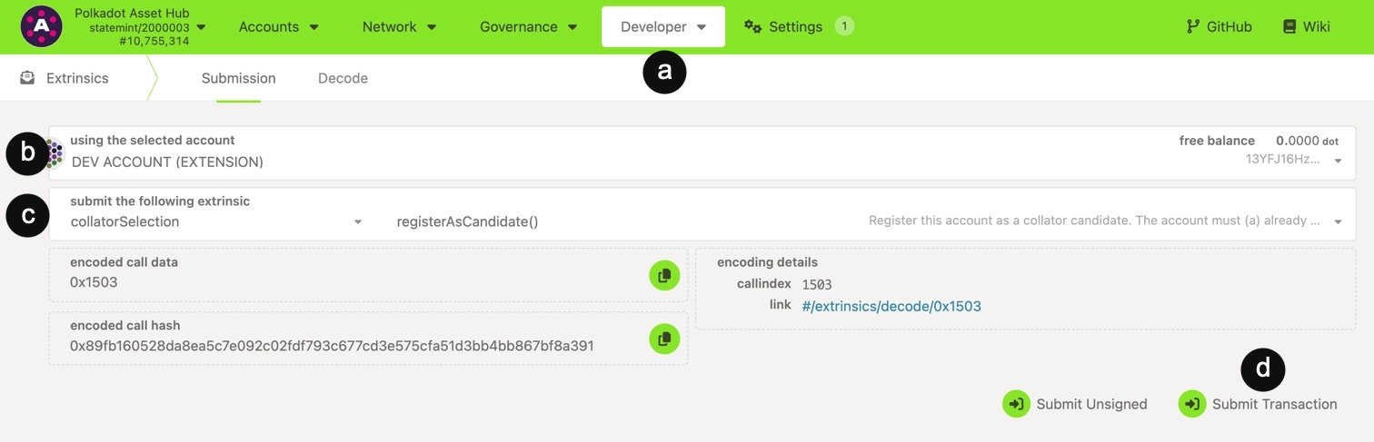 collatorSelection.registerAsCandidate. - Click Submit Transaction and sign the transaction. The required bond amount will be automatically reserved from your account based on the pallet's configured