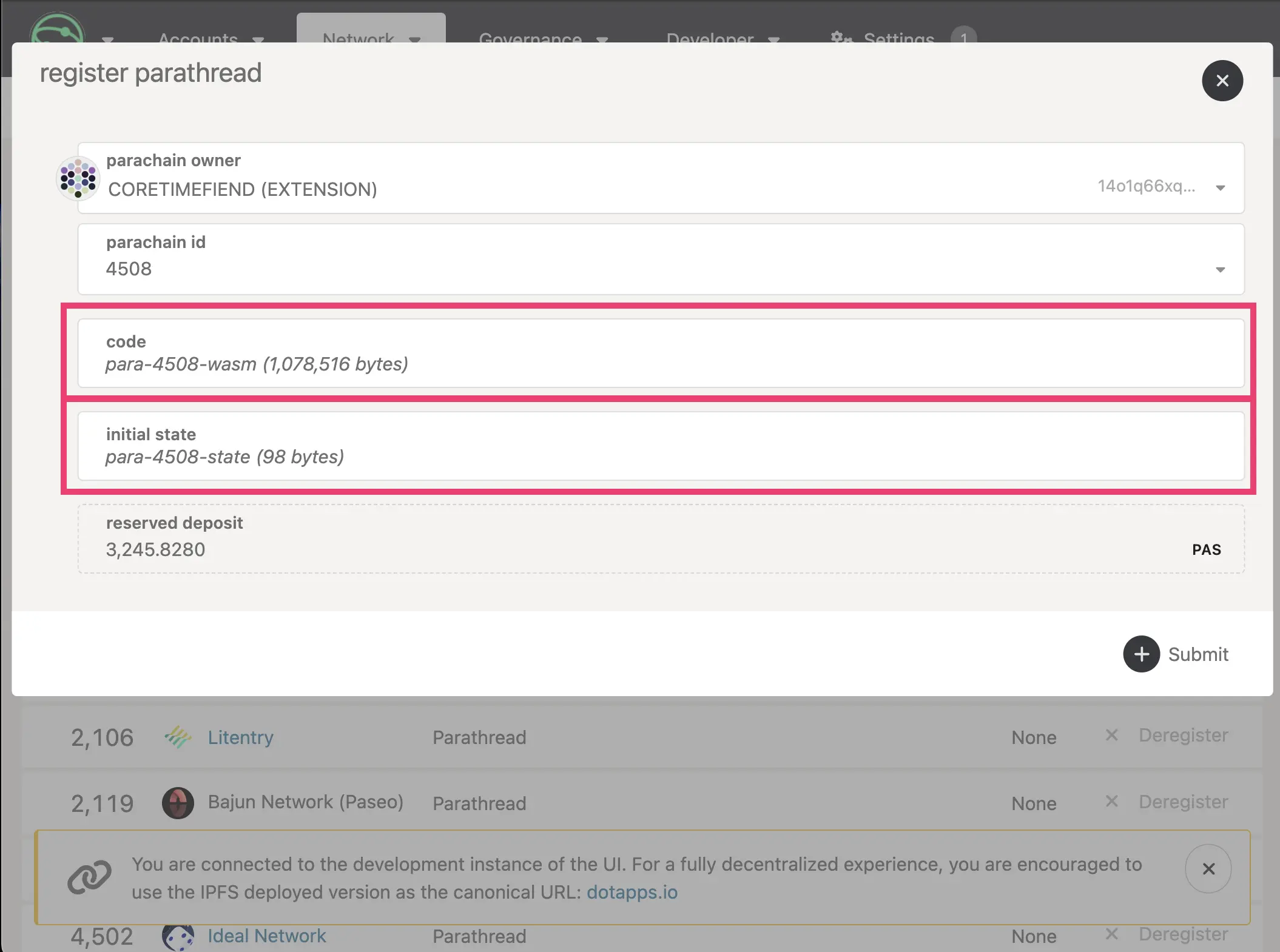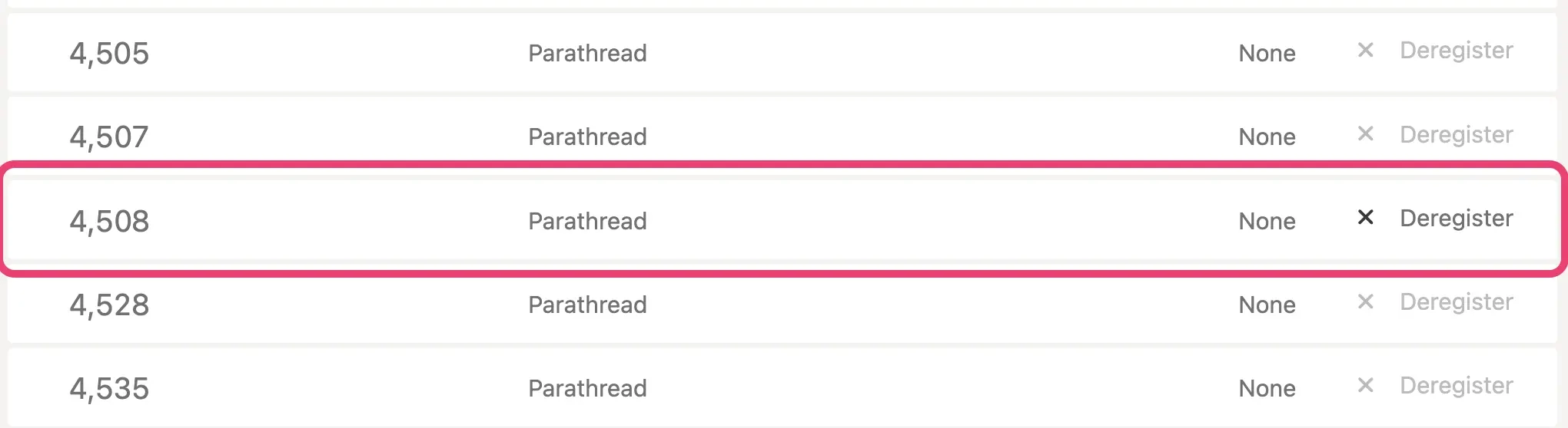 Confirm your details and click the + Submit button, where there should be a new Parathread with your parachain ID and an active Deregister button.
