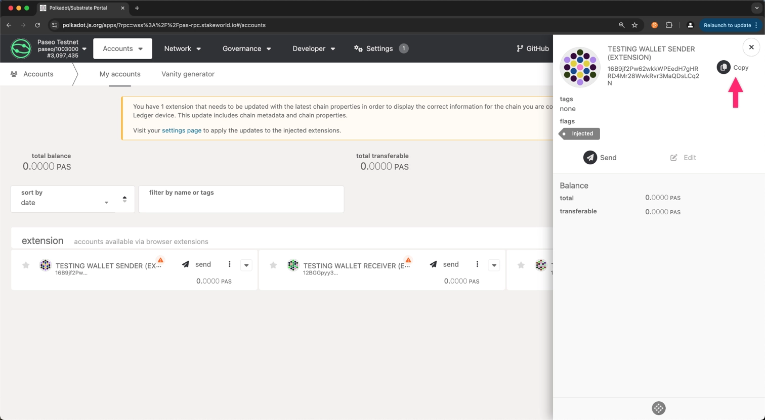 Open the Polkadot.js Apps: Paseo interface and connect to the Polkadot TestNet (Paseo).