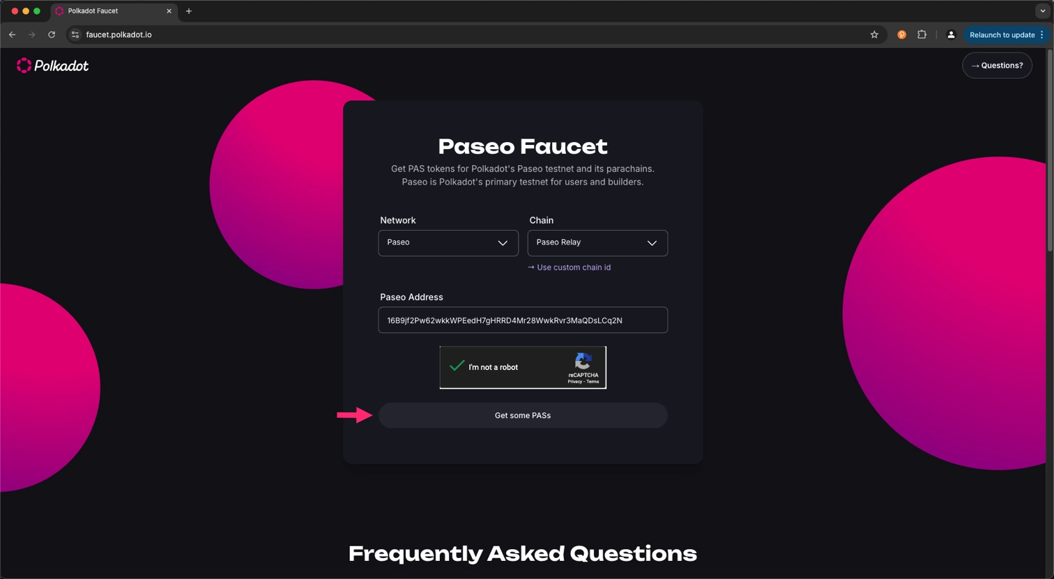 Visit the Polkadot Faucet and paste the copied address in the input field. Ensure that the network is set to Paseo and click on the Get some PASs button.