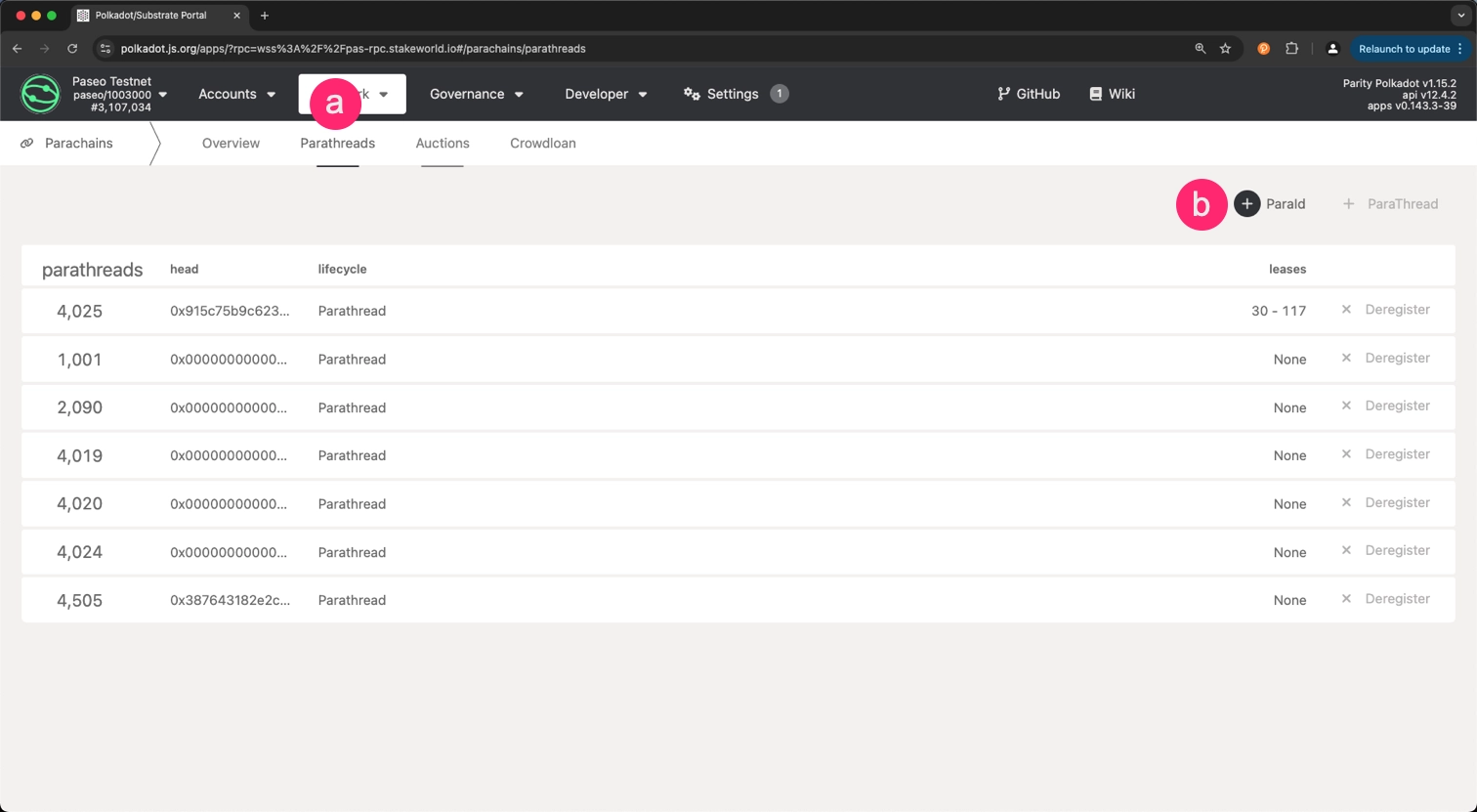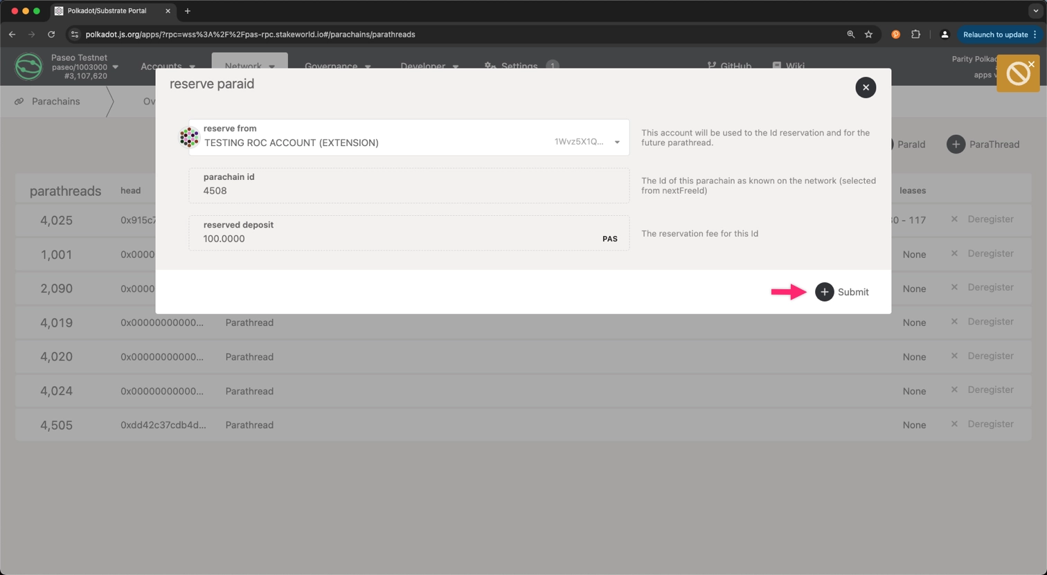 You must reserve a parachain identifier (ID) before registering your parachain on Paseo. You'll be assigned the next available identifier.