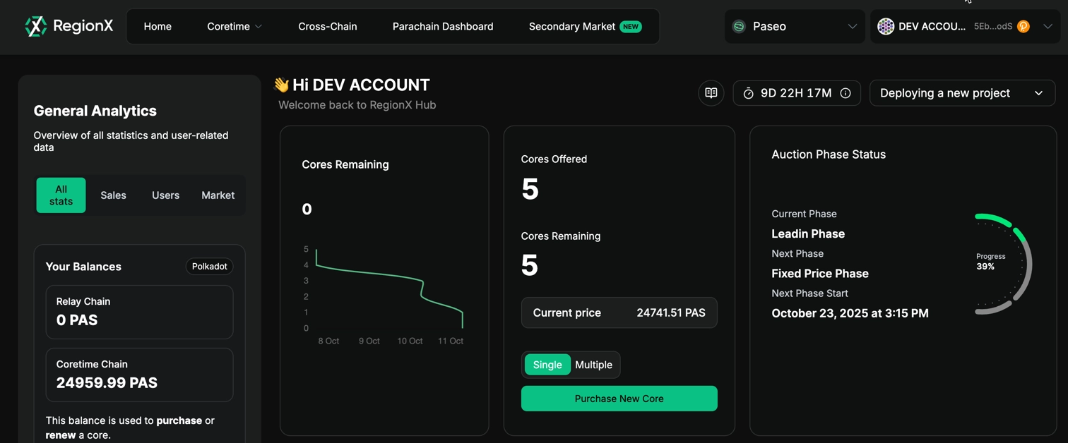 This tutorial shows you how to purchase bulk coretime using the RegionX Coretime Marketplace, a user-friendly interface for buying and managing cores on both the Polkadot TestNet and production networks.
