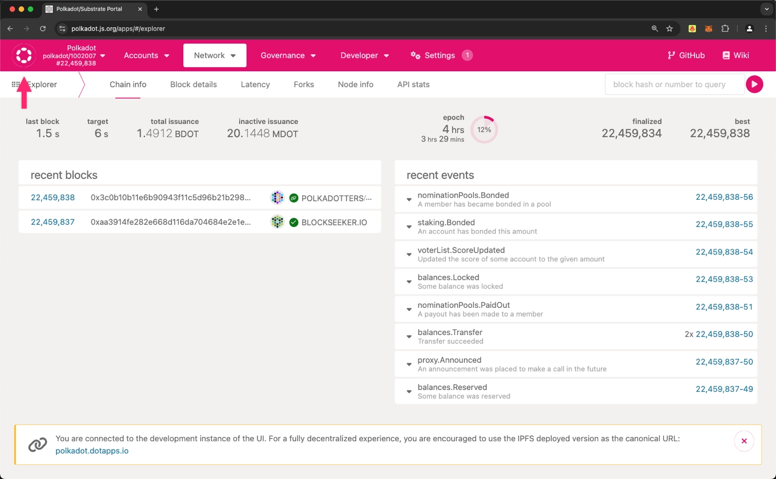 You are now connected to your local node and can interact with it through the Polkadot.js Apps interface. This tool enables you to explore blocks, execute transactions, and interact with your blockchain's features. For in-depth guidance on using the interface effectively, refer to the Polkadot.js Guides available on the Polkadot Wiki.
