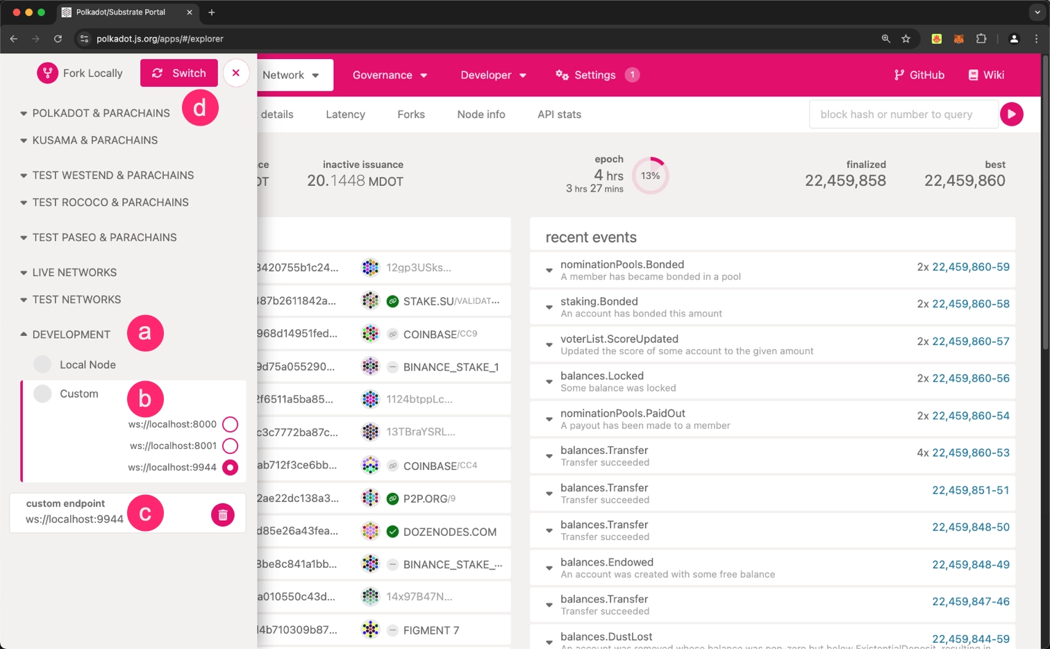ws://localhost:9944in the custom endpoint input field. - Click the Switch button.