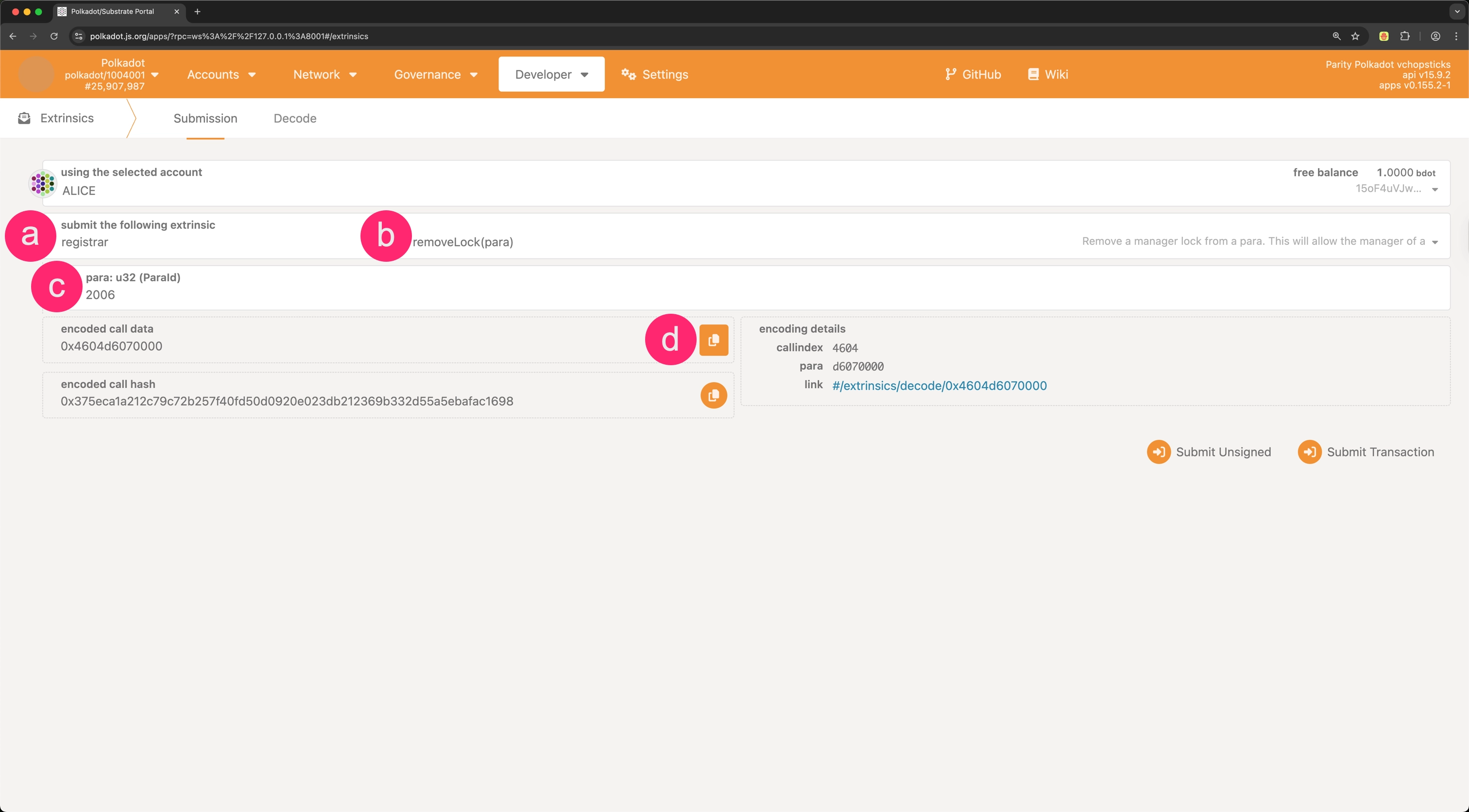 Before sending the XCM, you need to construct the relay chain call that will be executed. Follow these steps to prepare the registrar.removeLock extrinsic: