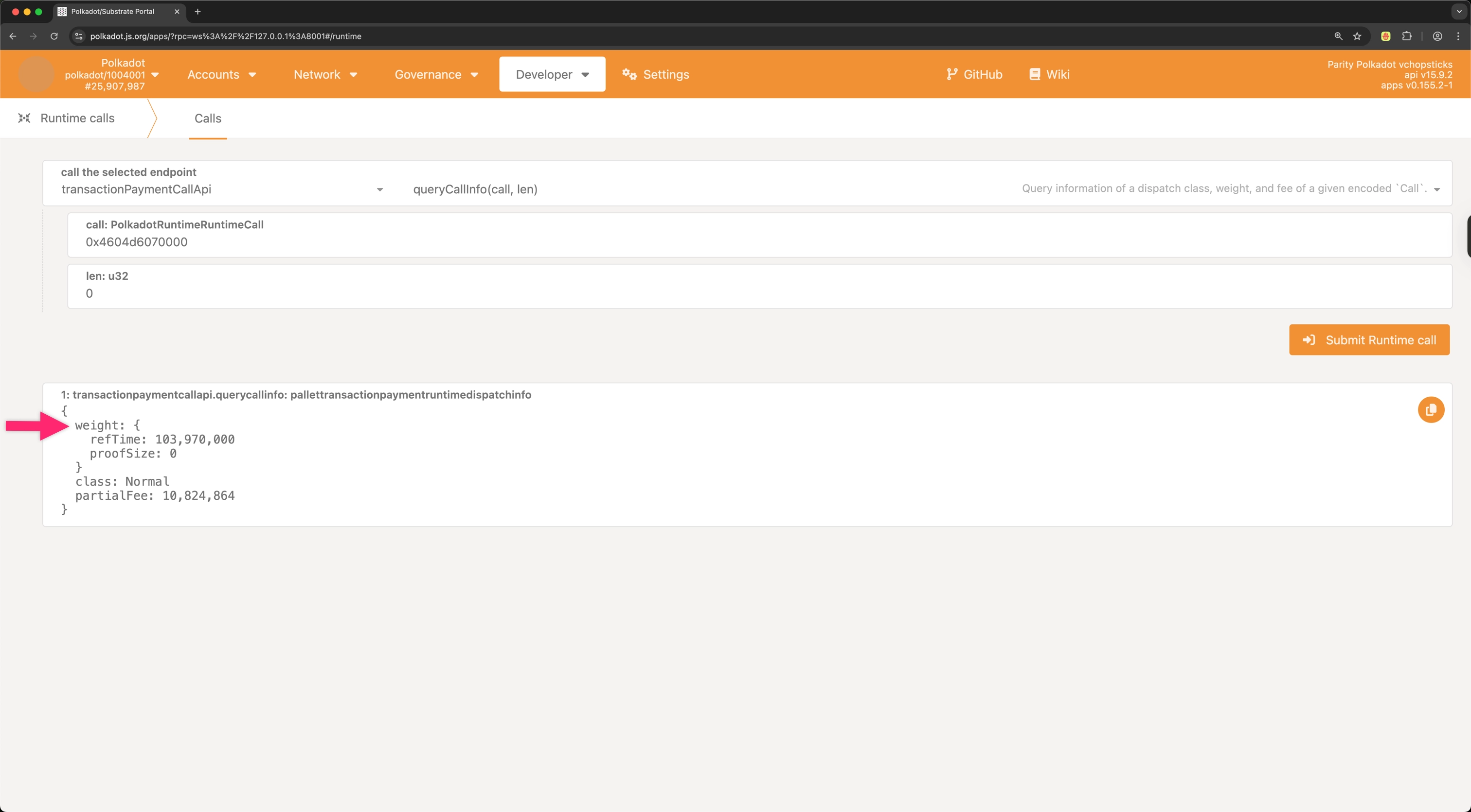 transactionPaymentCallApi.queryCallInforuntime call with the encoded call data previously obtained:This weight information is crucial for properly configuring your XCM message's execution parameters in the next steps.