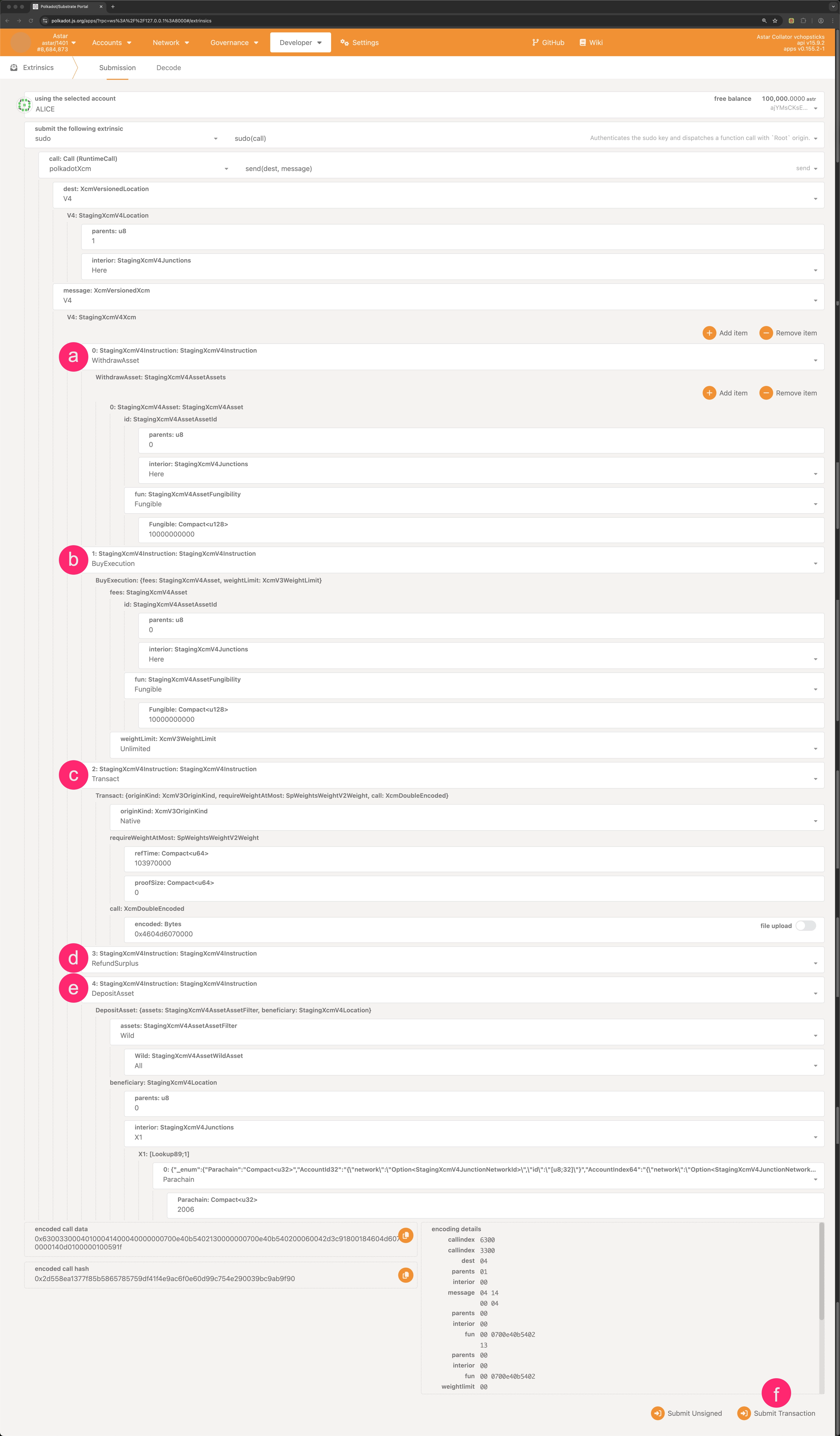 To validate your XCM, examine the following reference extrinsic showing the proper instruction sequence and parameter formatting. Following this structure will help ensure successful execution of your message.