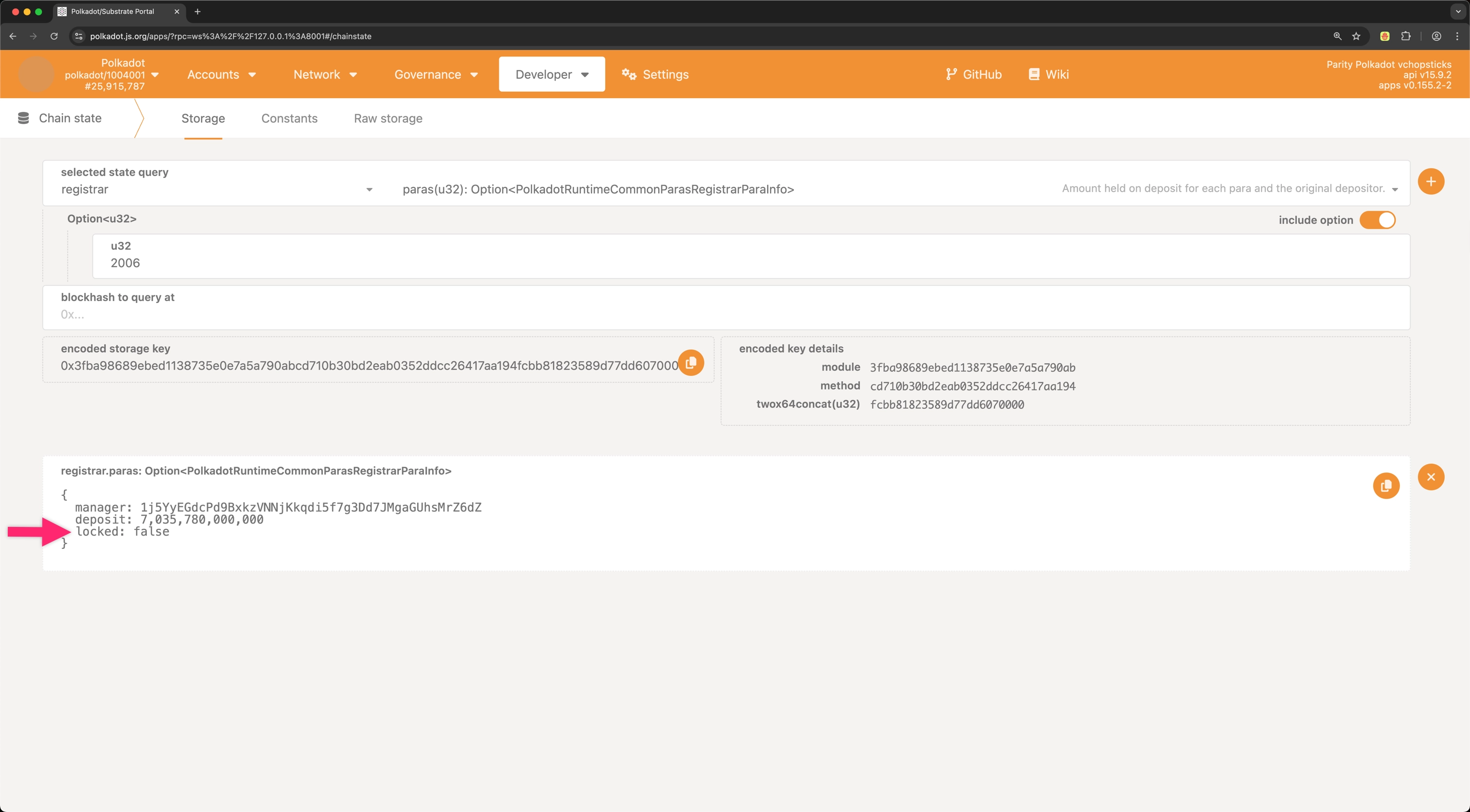 Before unlocking a parachain, you should verify its current lock status. This can be done through the Polkadot.js interface: