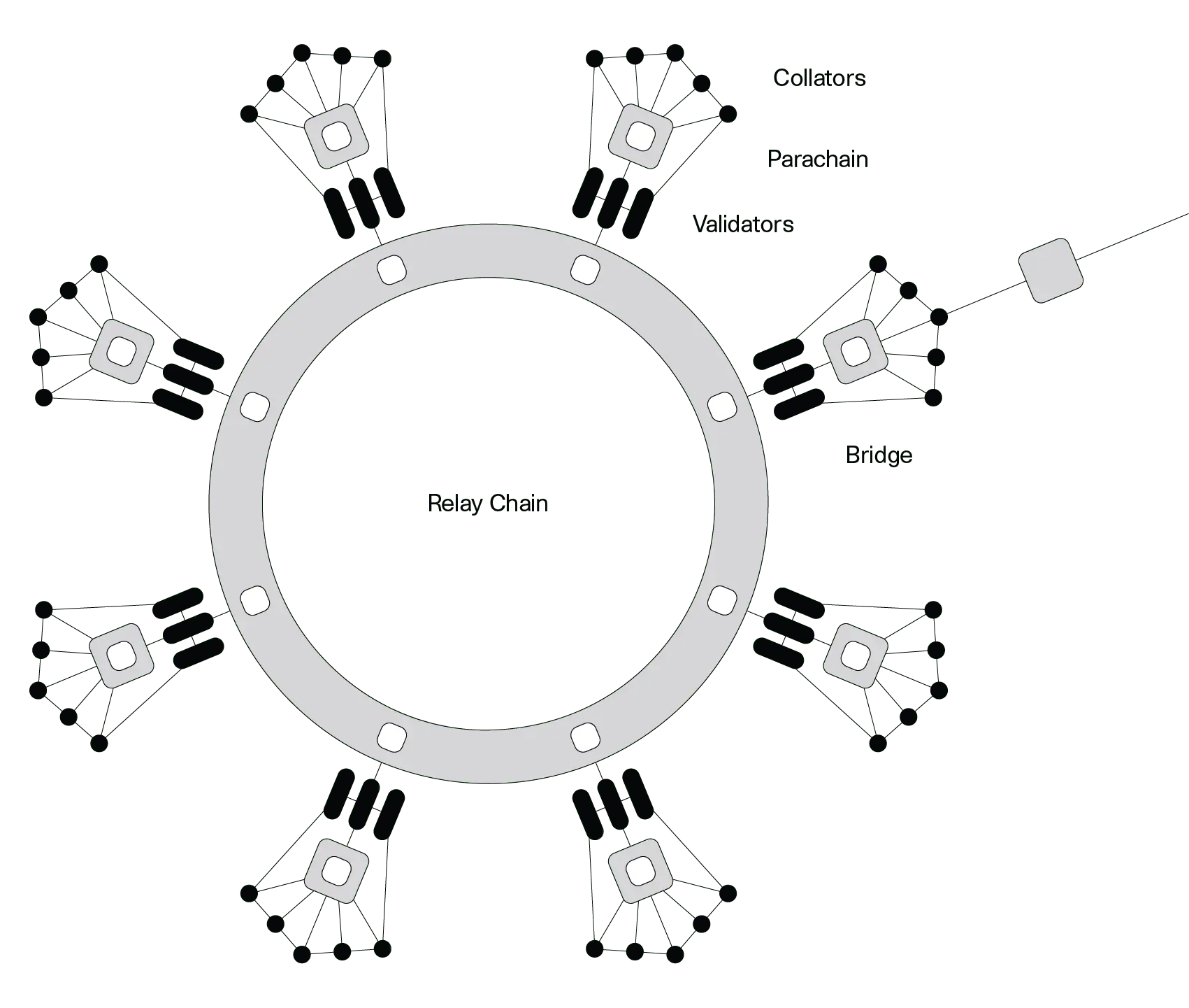 Polkadot features a chain that serves as the central component of the system. This chain is depicted as a ring encircled by several parachains that are connected to it.