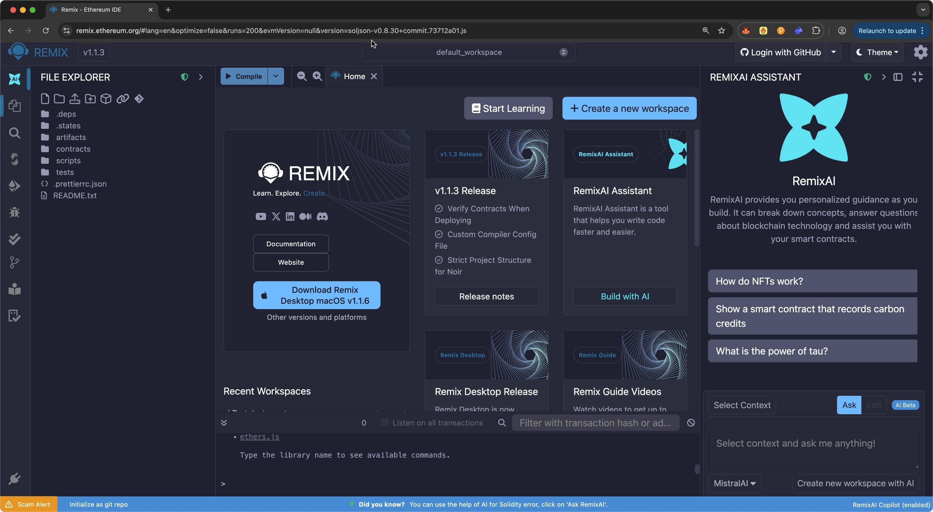 Navigate to https://remix.ethereum.org/. The interface will load with a default workspace containing sample contracts. In this interface, you can access the following: