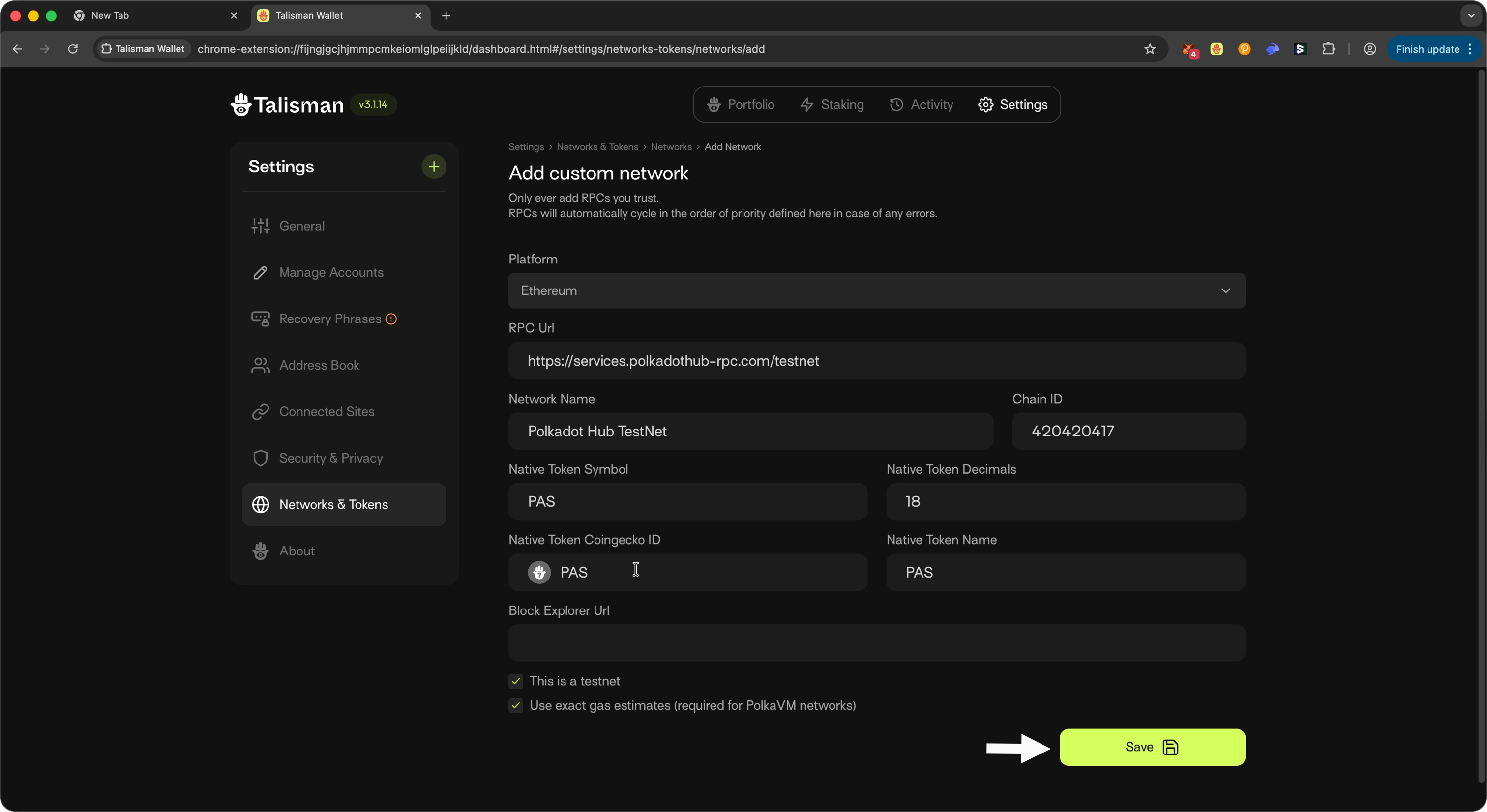 To use Talisman with Polkadot Hub TestNet: