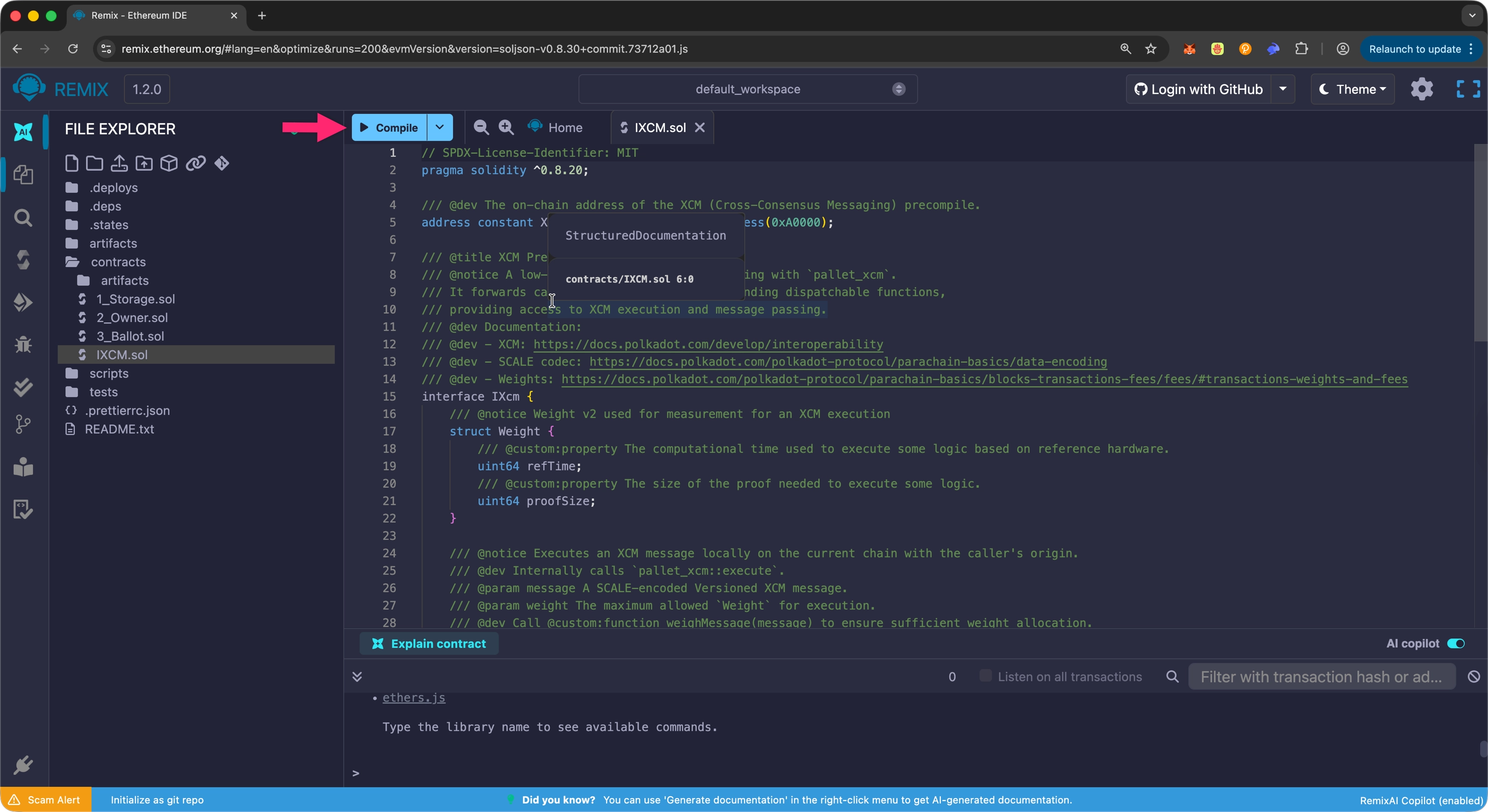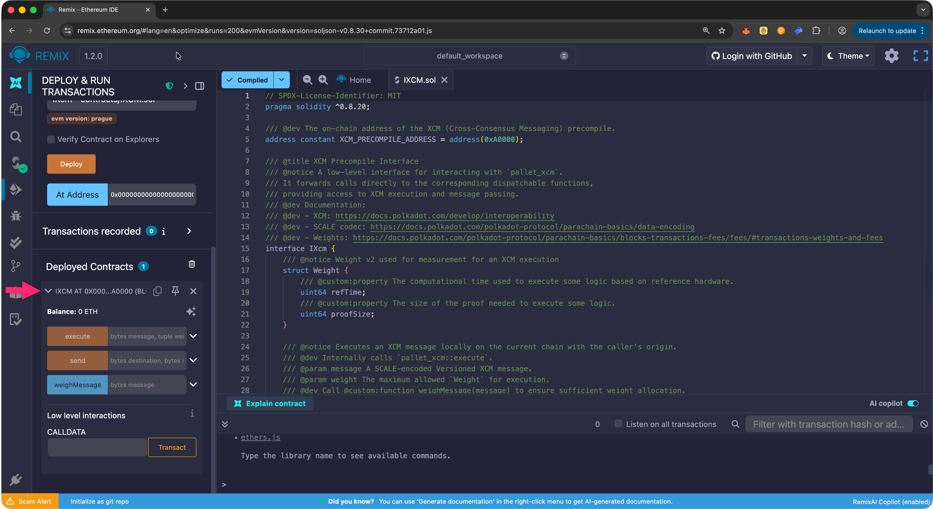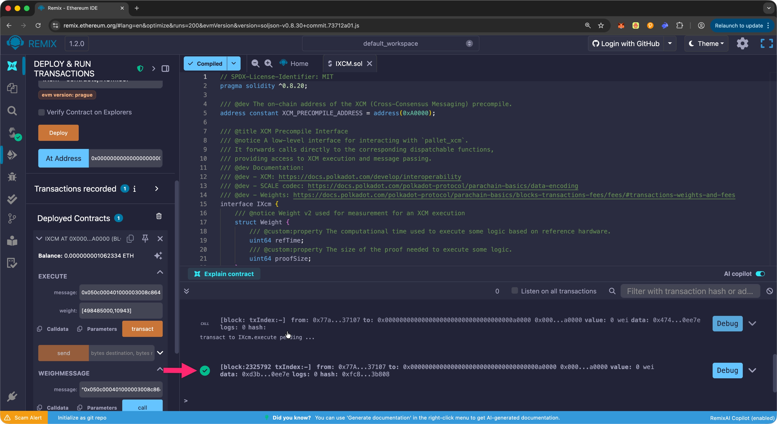 This guide demonstrates how to interact with the XCM precompile through Solidity smart contracts using Remix IDE.