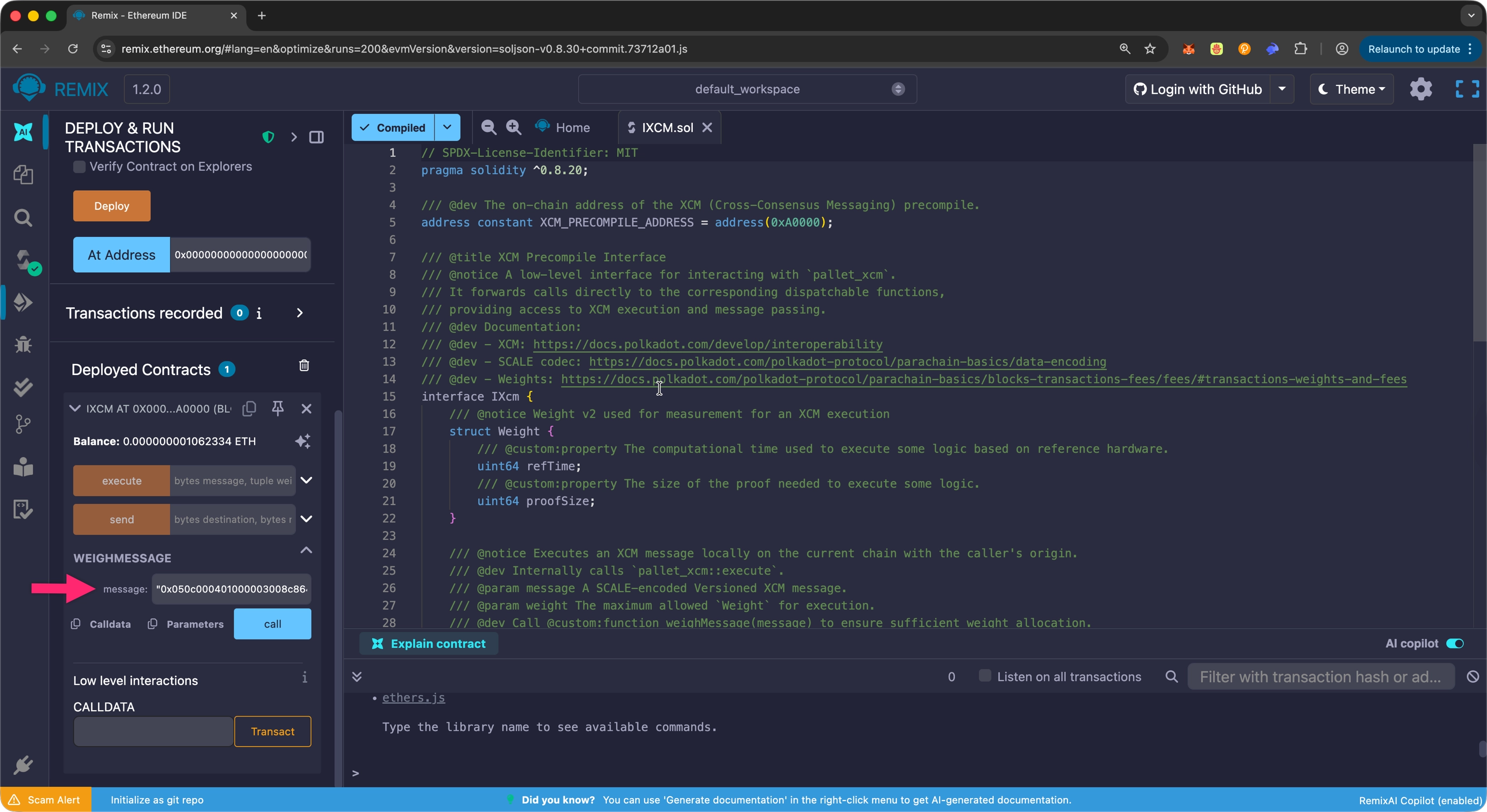 To test this functionality in Remix, you can call callWeighMessage with a SCALE-encoded XCM message. For example, for testing, you can use the following encoded XCM message: