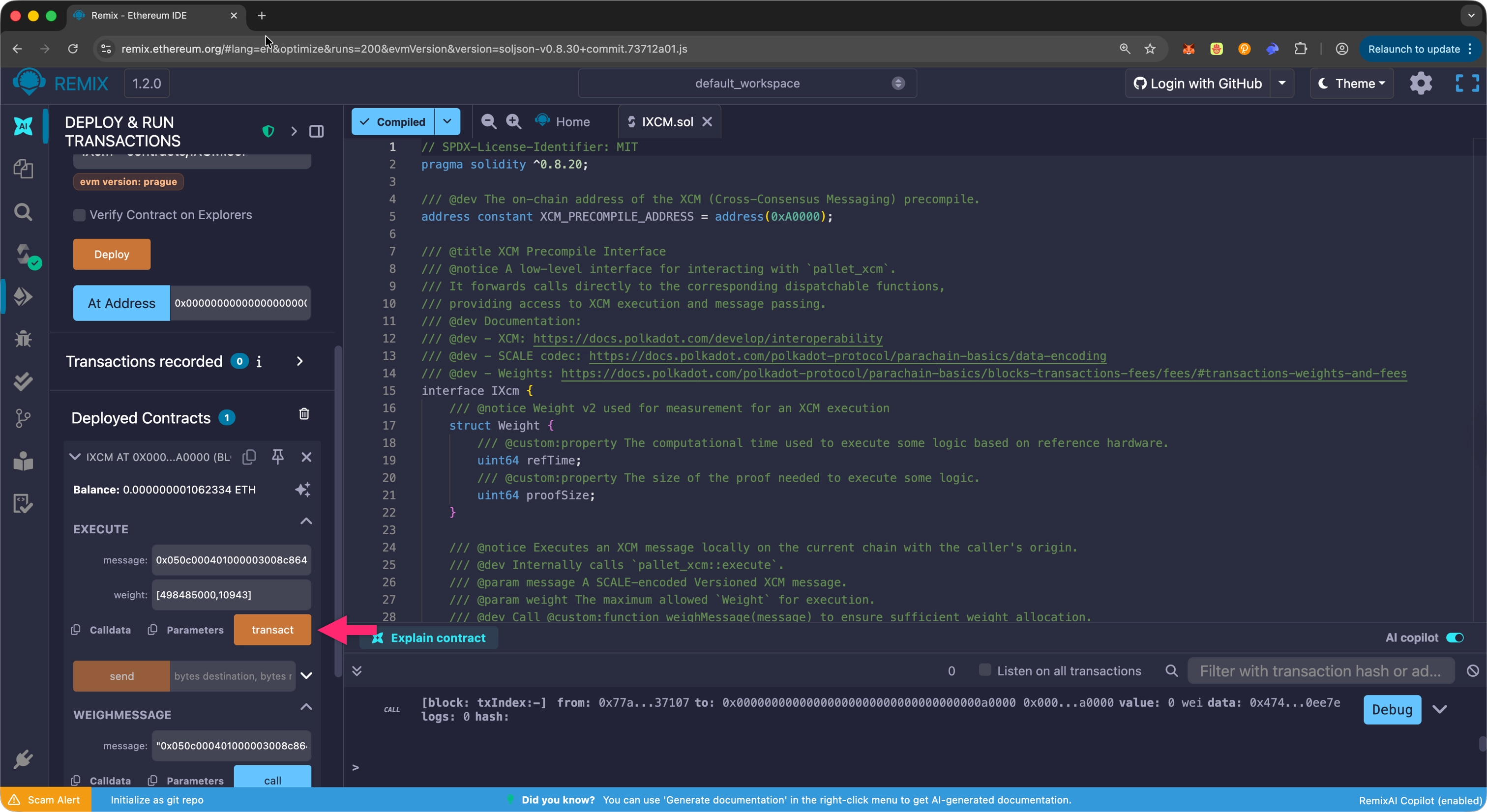 On Remix, click on the Transact button to execute the XCM message: